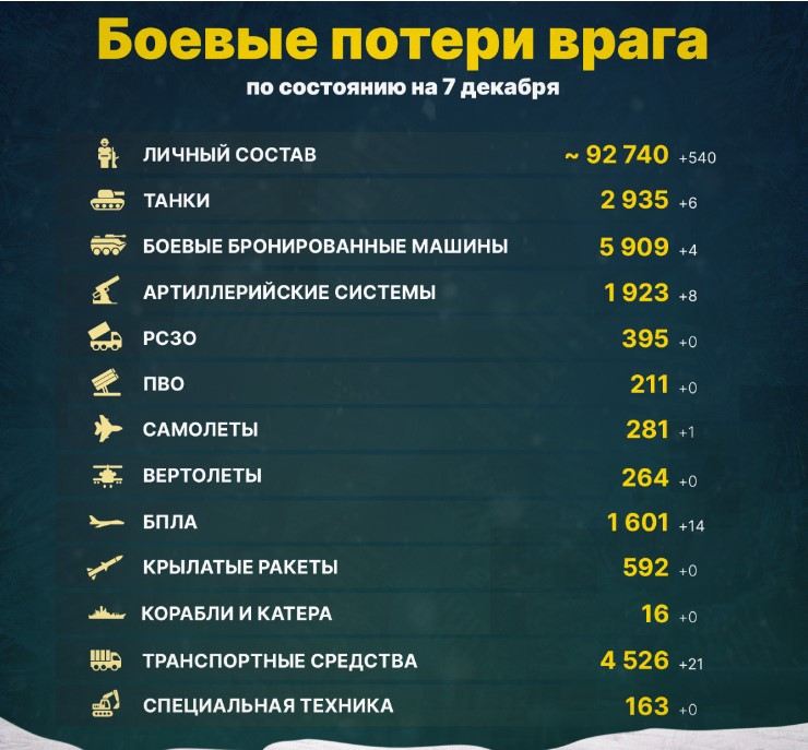 zirehli döyüş maşınları - 5909 (gündə +4) artilleriya sistemləri - 1923 (+8) MLRS - 395 hava hücumundan müdafiə sistemləri - 211 təyyarə - 281 vertolyotlar - 264 İHA əməliyyat-taktiki səviyyəsi - 1601 (+14) qanadlı raketlər - 592 gəmilər / qayıqlar - 16 avtomobil avadanlığı və tankerlər - 4526 (+21) xüsusi texnika -163.