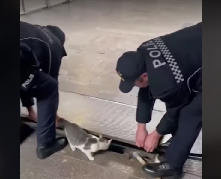 Görüntülərdə pişiyin dəmir lövhə arasında sıxışıb qaldığı, polislərin lövhəni qaldıraraq pişiyi oradan xilas etdikləri əks olunub.