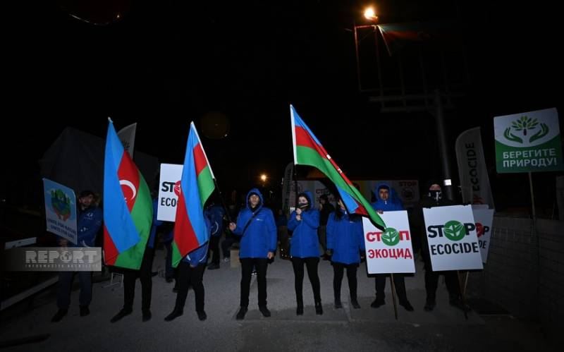 Hava şəraitinin soyuq olmasına baxmayaraq, Azərbaycanın Qarabağ iqtisadi rayonunda faydalı qazıntı yataqlarının qanunsuz istismarına qarşı Xankəndi-Laçın yolunda keçirilən etiraz aksiyası axşam saatlarında da davam edir.
