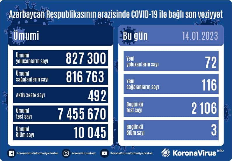 Azərbaycanda son sutkada koronavirus infeksiyasına 72 yeni yoluxma faktı qeydə alınıb, 116 nəfər müalicə olunaraq sağalıb və evə buraxılıb.