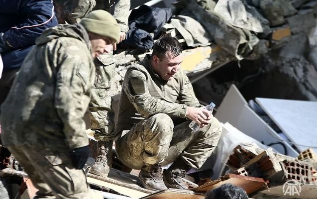 Dağıntılar olan ərazidən çəkilmiş fotolarda axtarış-xilasetmə işlərinə dəstək verən əsgərin göz yaşlarına hakim ola bilmədiyi görünür.