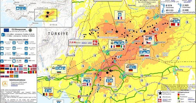 Aİ Komissiyasına bağlı Mülki Müdafiə və Humanitar Yardım təşkilatı, Aİ-nin Türkiyə bölgələrindəki yardım səylərinin xəritəsini paylaşıb və Aİ qruplarının Kahramanmaraş, Adıyaman, Malatya, Qaziantep, Adana və Hatayda koordinasiya mərkəzlərinin olduğunu qeyd edib.