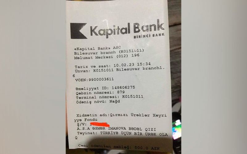 Biləsuvar sakini aldığı əməkhaqqının bir hissəsini Türkiyədə zəlzələdən zərərçəkən ailələrə göndərib.