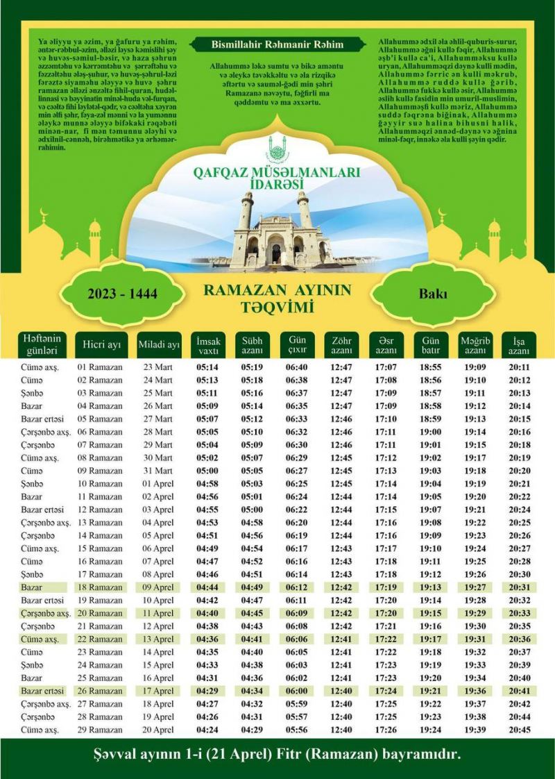 Sitat.info xəbər verir ki, Qafqaz Müsəlmanları İdarəsinin hazırladığı Ramazan ayının xüsusi təqvimi Bakı və Abşeron şəri vaxt ölçüsünə uyğun tərtib edilib.