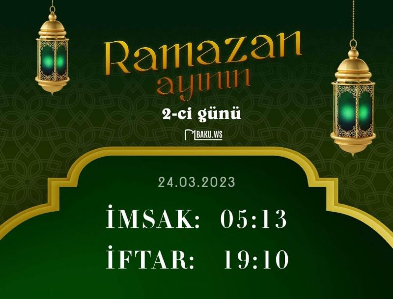 Sitat.info xəbər verir ki, Qafqaz Müsəlmanları İdarəsinin açıqladığı Ramazan təqviminə əsasən, martin 24-də imsak vaxtı saat 05:13-də, iftar vaxtı isə 19:10-dadır.