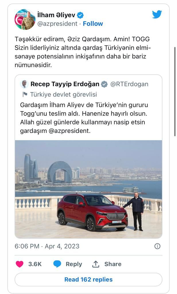 "Təşəkkür edirəm, Əziz Qardaşım. Amin! TOGG Sizin liderliyiniz altında qardaş Türkiyənin elmi-sənaye potensialının inkişafının daha bir bariz nümunəsidir", - deyə paylaşımda deyilir.