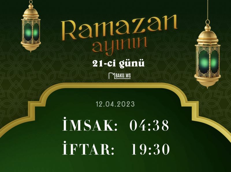 Qafqaz Müsəlmanları İdarəsinin açıqladığı Ramazan təqviminə əsasən, aprelin 12-də imsak vaxtı saat 04:38-də, iftar vaxtı isə 19:30-dadır.