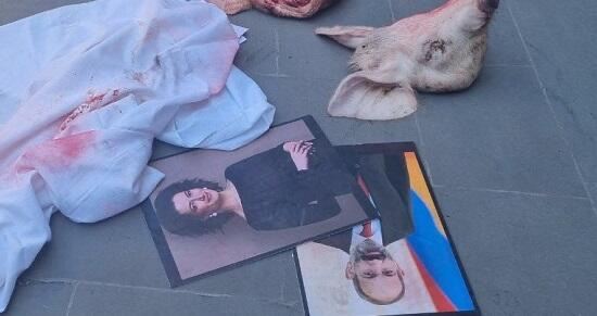 Aksiyaçılar Paşinyana etiraz olaraq yerə kəsilmiş donuz başları, Paşinyan və Anna Akopyanın şəkillərini atıblar. Hətta donuz başlarını da qan əlaməti olaraq qırmızı rənglə boyayıblar.