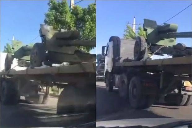Görüntülər Divandərə şəhərindəndir. Videoda ağır hərbi texnikaların yük maşını ilə daşınması əks olunub.