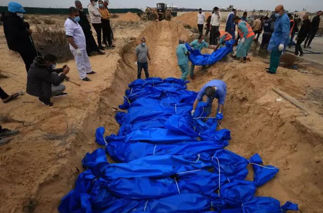 Beynəlxalq xəbər agentliyi AFP, İsrail hücumları nəticəsində həlak olanların Xan Yunisdəki kütləvi məzarlıqda mavi cəsəd torbaları ilə dəfn olunduğunu əks etdirən fotolar yayımlayıb.