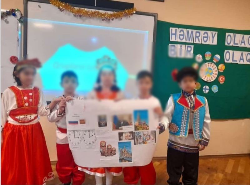 Rusiyanın vurduğu, təyyarəmizdə həlak olanların heç üçü çıxmamış, şagirdləri rəngarəng geyindiriblər və Kreml lideri Vladimir Putinin olduğu fotonun əks edildiyi divar qəzeti hazırlayıblar.