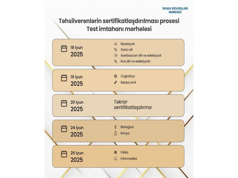 Təhsilverənlərin sertifikatlaşdırılması prosesinin test imtahanı mərhələsi 18-20, 24 və 25 iyun tarixlərində təşkil olunacaq.