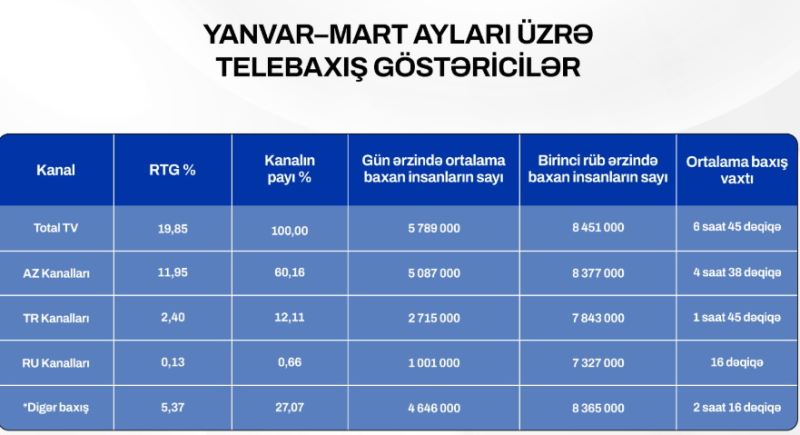 Bəzən belə fikirlər səslənir ki, Azərbaycanda televiziya tamaşaçısı daha çox xarici telekanallara üstünlük verir. Amma telebaxış göstəriciləri bunun tam əksini göstərir – gün ərzində ortalama televiziyaya baxan 5 milyon 789 min insanın 60 faizdən çoxu – 5 milyon 87 min nəfəri məhz Azərbaycan kanallarına baxır. Ümumilikdə, 2025-ci ilin yanvar, fevral və mart aylarında telebaxış göstəriciləri aşağıdakı kimidir: