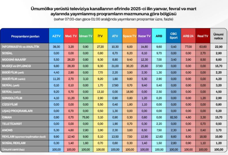 2025-ci ilin yanvar, fevral və mart aylarında 11 televiziya kanalında məzmuna görə bölgü: