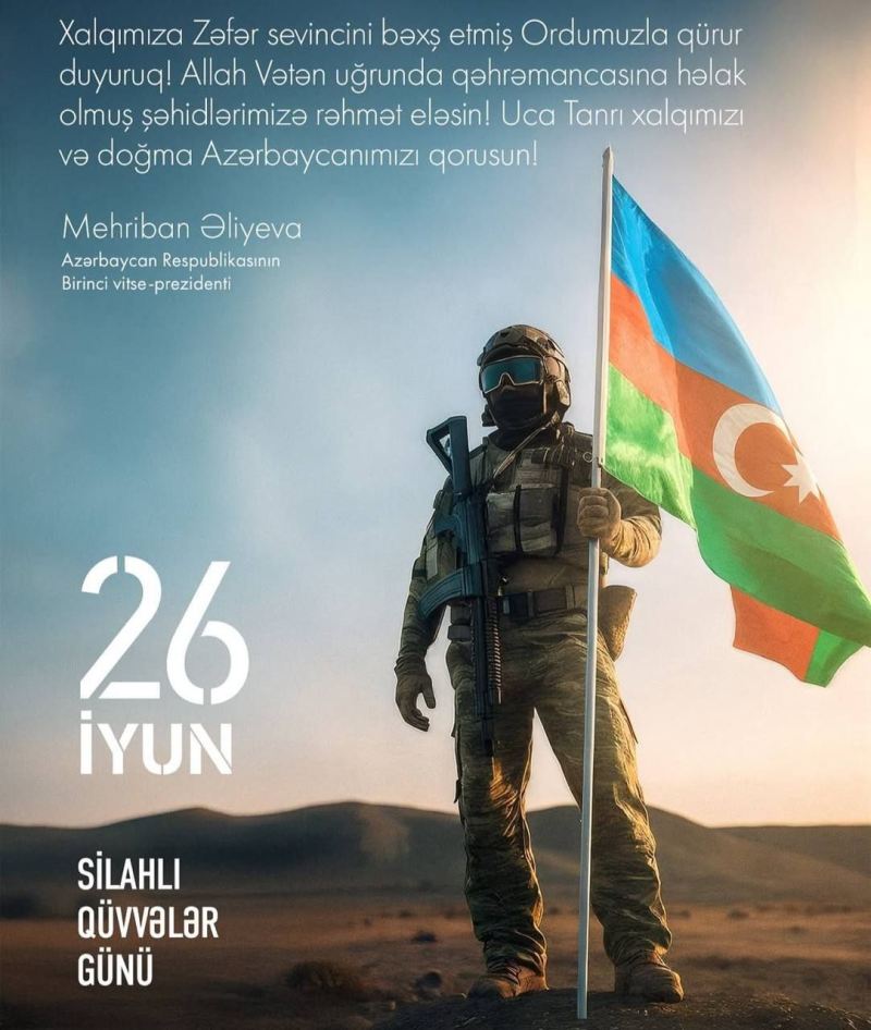 Azərbaycan Respublikasının Birinci vitse-prezidenti Mehriban Əliyeva instaqram hesabında 26 İyun - Silahlı Qüvvələr Günü münasibətilə paylaşım edib. Sitat.info paylaşımı təqdim edir: