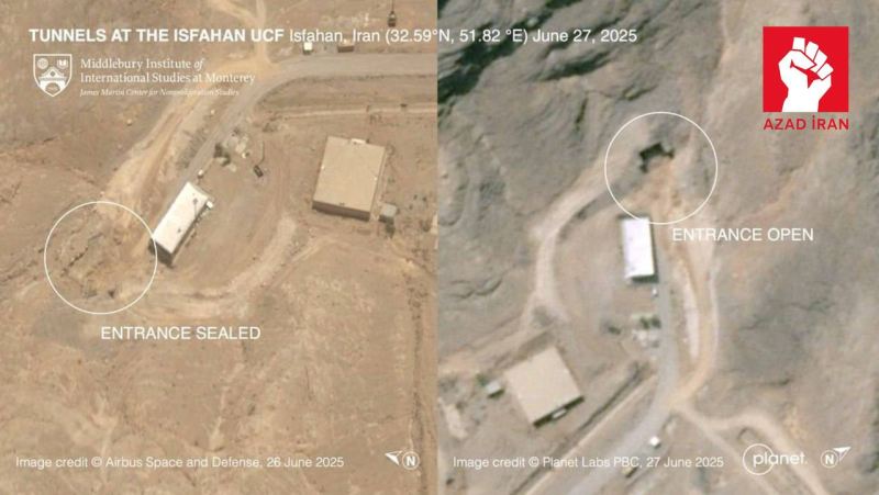 Kadrlardan aydın olur ki, İsrailin hücumları nəticəsində İsfahan şəhərində yerləşən və dərinliyi ən azı 100 metr olan nüvə obyektinin girişi bağlanıb.