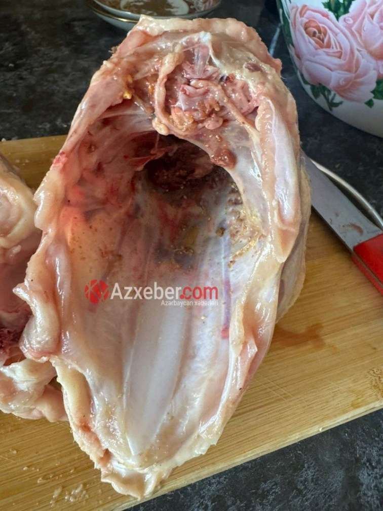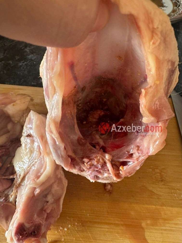Onun sözlərinə görə, , qablaşdırmadan açılan toyuğun daxilində orqan və qan parçaları qalıb.