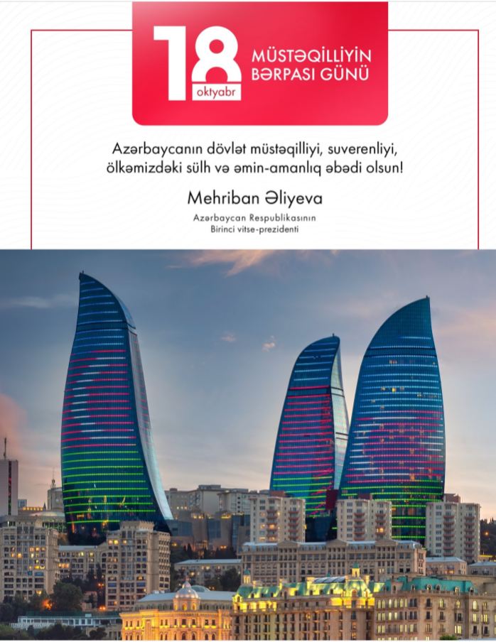 Azərbaycanın Birinci vitse-prezidenti Mehriban Əliyeva rəsmi instaqram səhifəsində Müstəqilliyin Bərpası Günü ilə bağlı paylaşım edib.