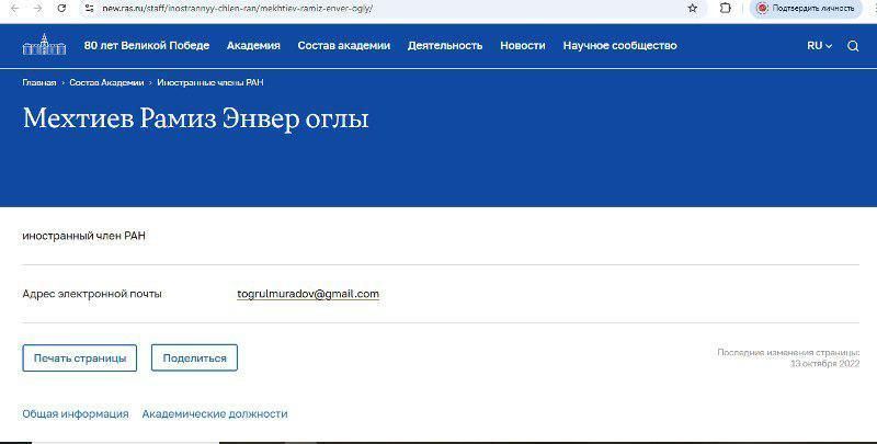 Ramiz Mehdiyev 2022-ci ildən Rusiya Elmlər Akademiyasının (REA) üzvü statusuna malikdir. Onun adı Rusiya Elmlər Akademiyasının saytında da yerləşdirilib.