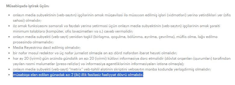 Artıq 1 ildir ki, tətbiq olunan   qaydalardan biri də fəaliyyətinin 2 ili tamam olmayan media subyektlərinin müsabiqədə iştirakının məhdudlaşdırılmasıdır. Əgər əvvəllər fəaliyyətinin ilk 6 ayında belə saytlar müsabiqəyə qatılıb maliyyə dəstəyi qazana bilirdisə, indi bu mümkün olmayacaq. Yeni yaranan saytlar yalnız iki il  fasiləsiz fəaliyyət göstərdikdən sonra müsabiqədə iştirak haqqı qazanırlar.