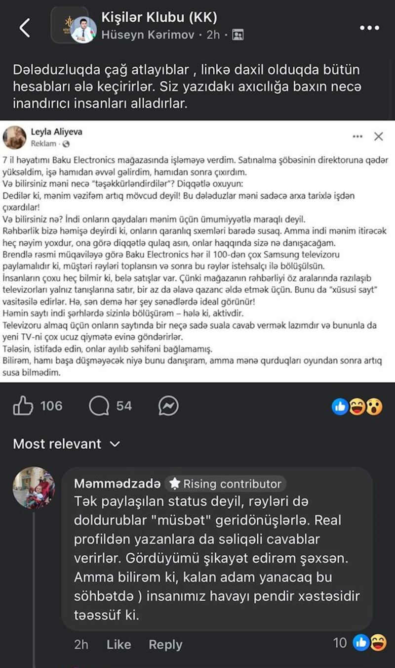 Sosial şəbəkədə yeni dələduzluq üsulu yayılıb. "Baku electronics"də çalışan şəxsin adından yayılan açıqlamada insanların emosiyalarına təsir edərək məlumatları ələ keçirilir.