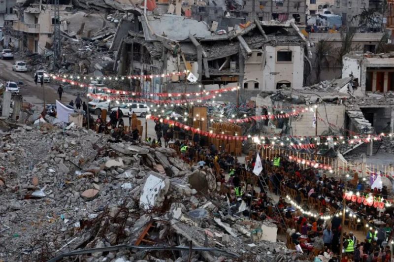 Qəzza zolağının şimalındakı Qəzza şəhərinin əş-Şucaiyyə məhəlləsində yüzlərlə fələstinli dağılmış küçələrdə dağıntılar arasında qurulmuş böyük bir süfrədə toplu şəkildə ilk oruclarını açıb.