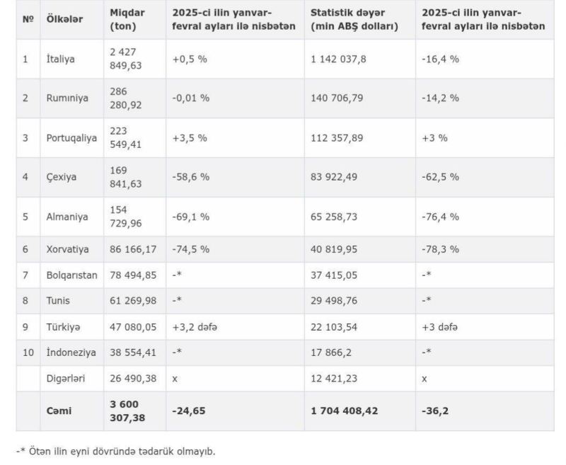 2026-ci ilin iki ayında Azərbaycan İtaliyaya 1 milyard 142 milyon 38 min ABŞ dolları dəyərində 2 milyon 427 min 850 ton, Rumıniyaya 140 milyon 707 min ABŞ dolları dəyərində 286 min 281 ton, Portuqaliyaya 112 milyon 358 ABŞ dolları dəyərində 223 min 549 ton xam neft ixrac edib.