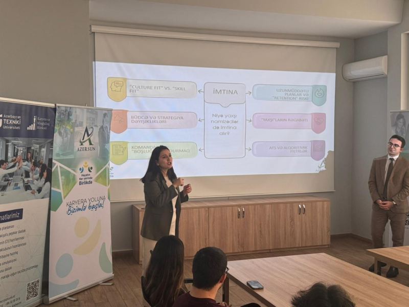 Bununla yanaşı, tələbələr üçün praktiki təlimlər də təşkil olunur. Bu təlimlərdə iştirakçılar müsahibə mərhələləri, işə müraciət qaydaları və əmək bazarında tələb olunan əsas səriştələr barədə bilik və bacarıqlarını inkişaf etdirmək imkanı əldə edirlər.